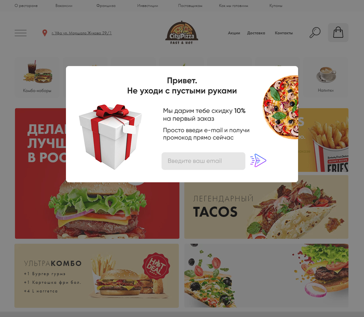 Если клиент уходит с сайта, а у нас нет никакой информации о нём, мы можем потерять его навсегда. Чтобы этого не произошло, при попытке ухода с сайта показывается поп-ап, который предлагает скидку 5% в обмен на электронный адрес.