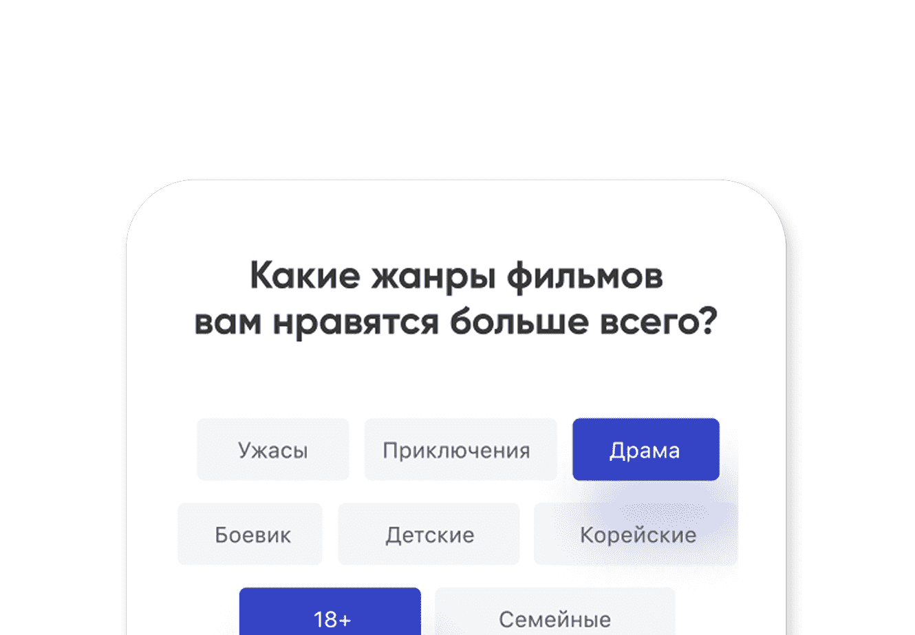 В ходе знакомства с KADR (онбординга), пользователя просят указать любимые жанры и проставить рейтинг фильмов, которые он уже смотрел. Зачем сразу начинать с этого? Потому что ключ успеха в том, чтобы помогать пользователям находить новые фильмы и телешоу.