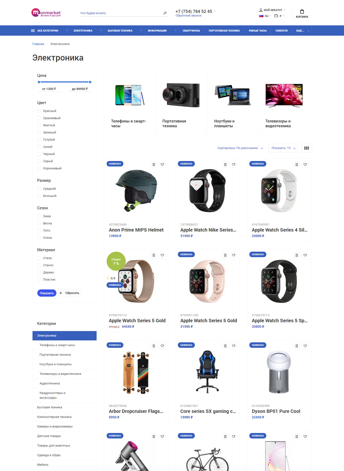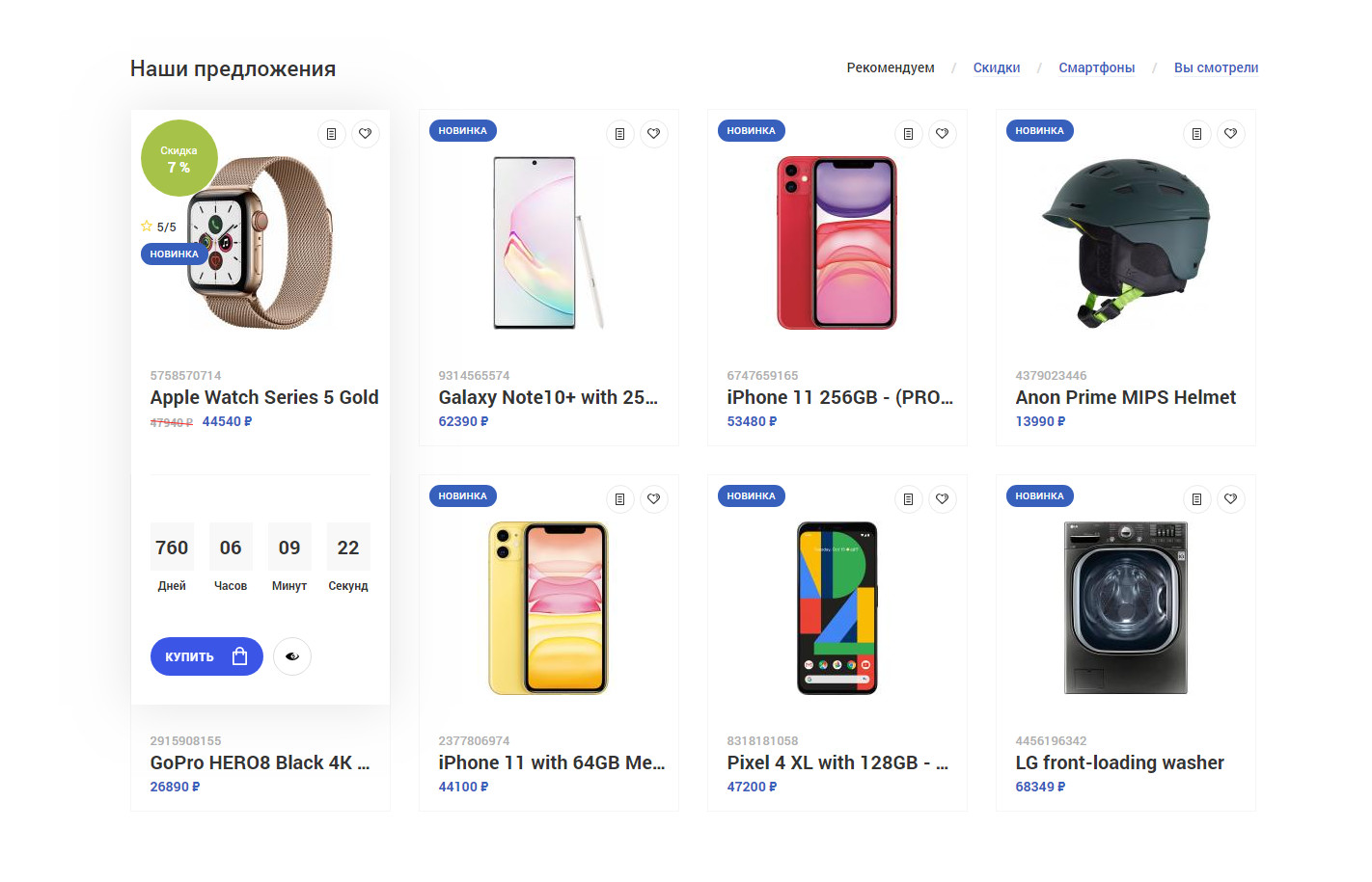 (просмотренные, популярные, акции, лидеры продаж, товары из категорий с различными сортировками, рандомный вывод товаров)