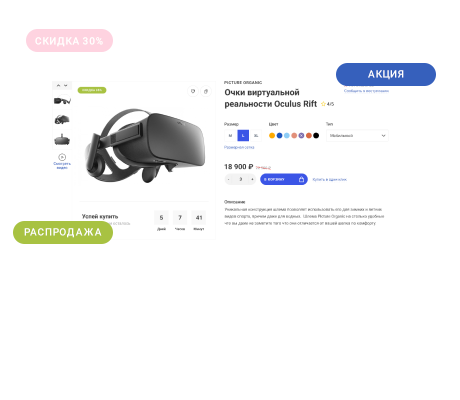 (скидка в % или в валюте, новинка, хит продаж, популярный товар, успей купить с зависимостью от наличия товара)